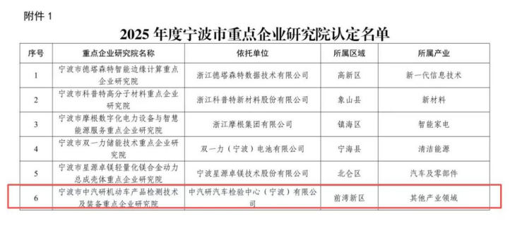 近日,寧波市2025年度擬認定市級重點企業(yè)研究院名單公示,中汽研汽車檢驗中心(寧波)有限公司(以下簡稱“公司”)憑借自身的技術(shù)實力成功躋身市級科創(chuàng)陣營,斬獲重點研究院殊榮——寧波市中汽研機動車產(chǎn)品檢測技術(shù)及裝備重點企業(yè)研究院,標(biāo)志著公司在汽車檢測領(lǐng)域科研能力獲市級權(quán)威認可。