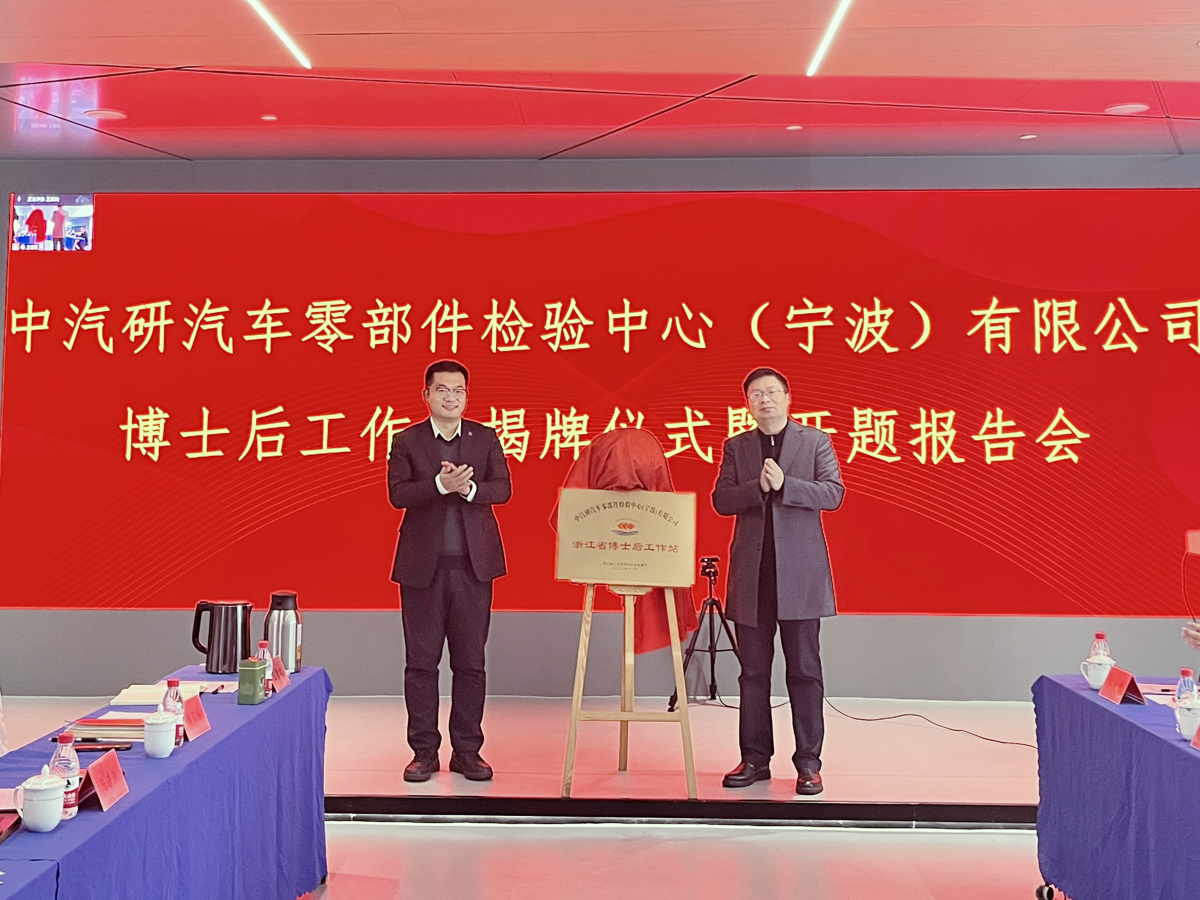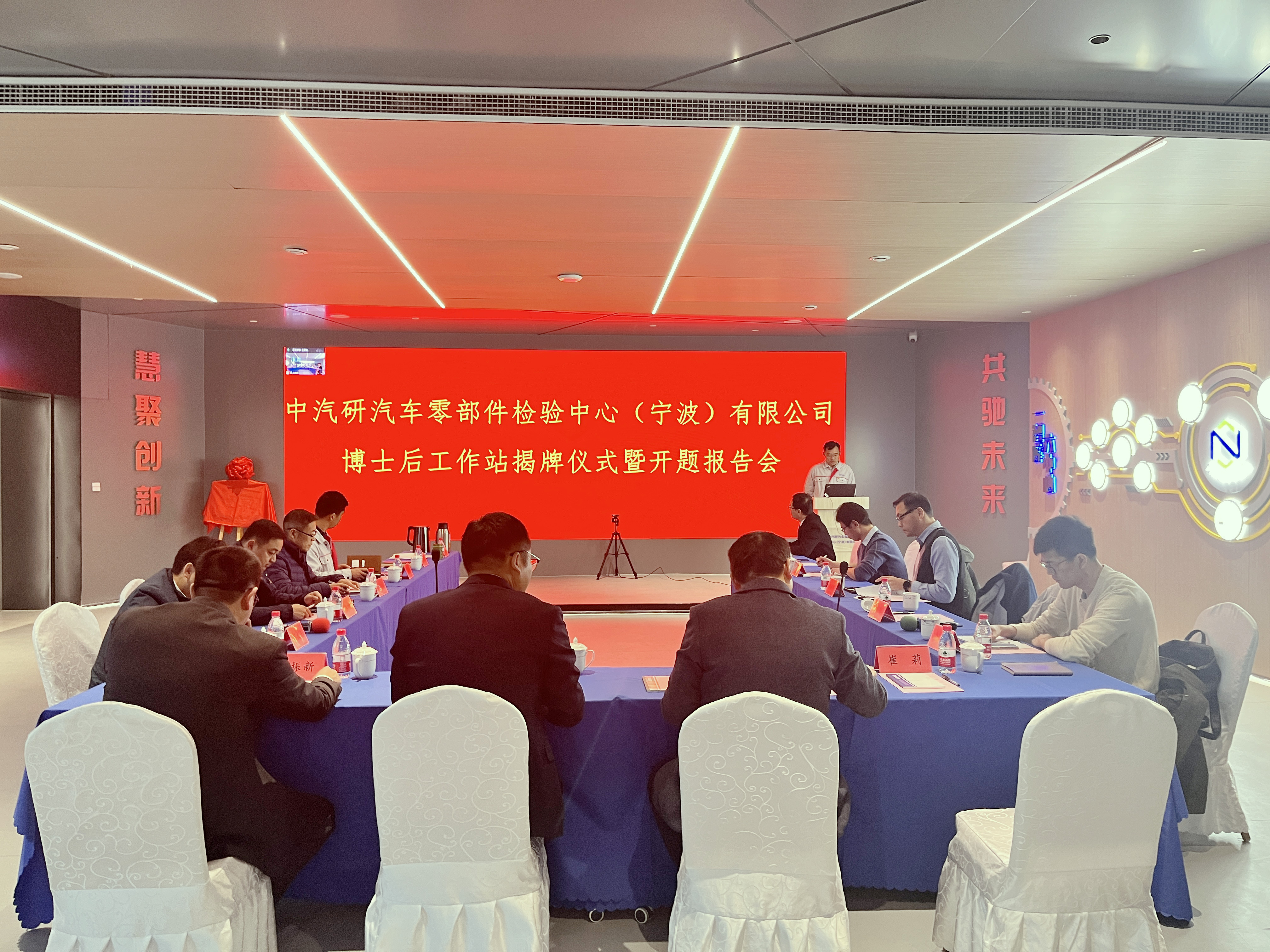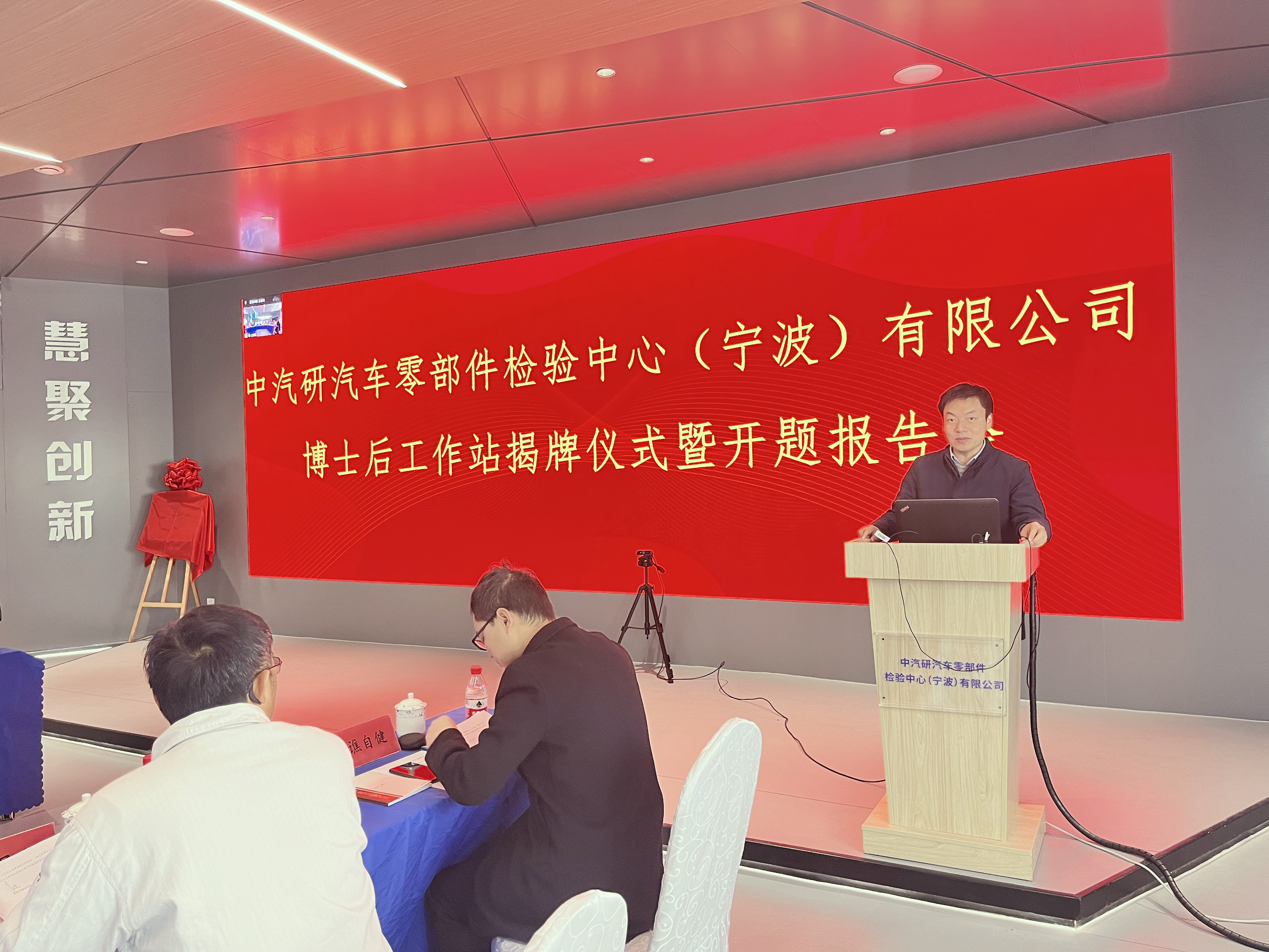 12月1日,博士后工作站授牌儀式暨開題報告會在中汽研汽車零部件檢驗中心(寧波)有限公司(以下簡稱“寧波零部件公司”)舉行。寧波市人力資源和社會保障局專技處處長郭濤、鄞州區人力資源和社會保障局專技科科長王輝應邀出席;寧波大學機械工程與力學學院副院長彭文飛、重慶大學博士生導師、教授廖昌榮等評審專家,寧波零部件公司黨支部書記、副總經理曹建驍,常務副總經理王振新、副總經理傅鍵等參加會議。